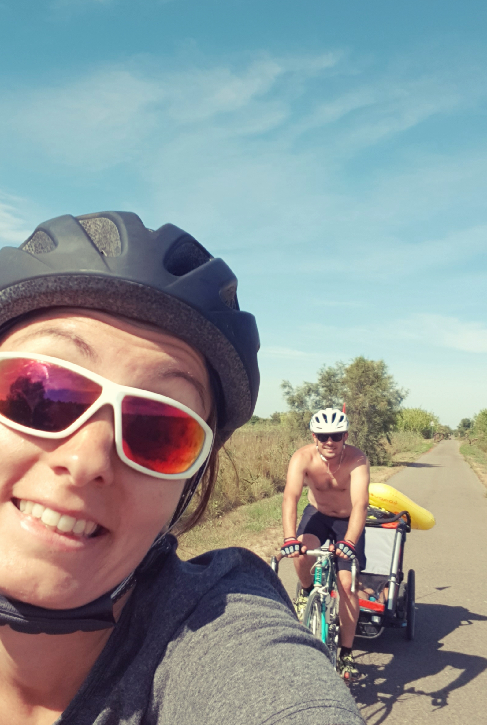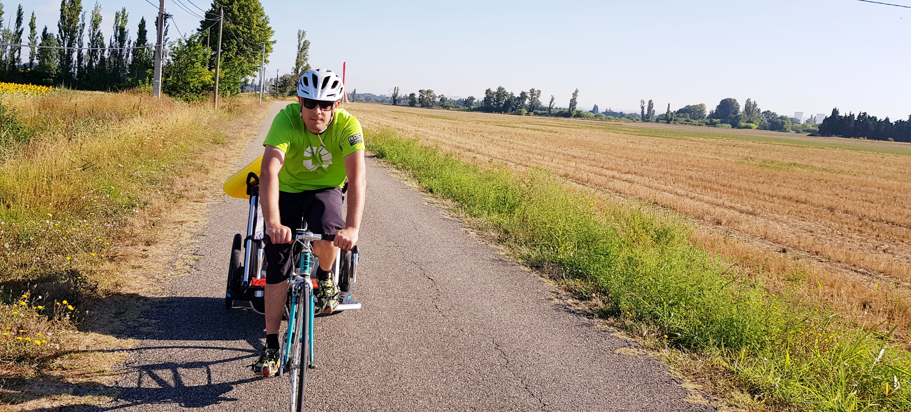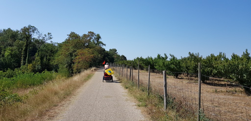 Nous traversons Avignon, puis nous nous retrouvons dans les vergers et les champs de tournesols. La différence de floraison est assez stupéfiante, lorsque nous prenons le temps d’y regarder ! Nous retrouvons Fred & Sandrine, avec leurs filles toujours aussi motivées, et nous partageons un bout de route ensemble. Des personnes, que tu ne connais pas et qui partagent les mêmes folies estivales, c’est tellement inattendu et agréable !