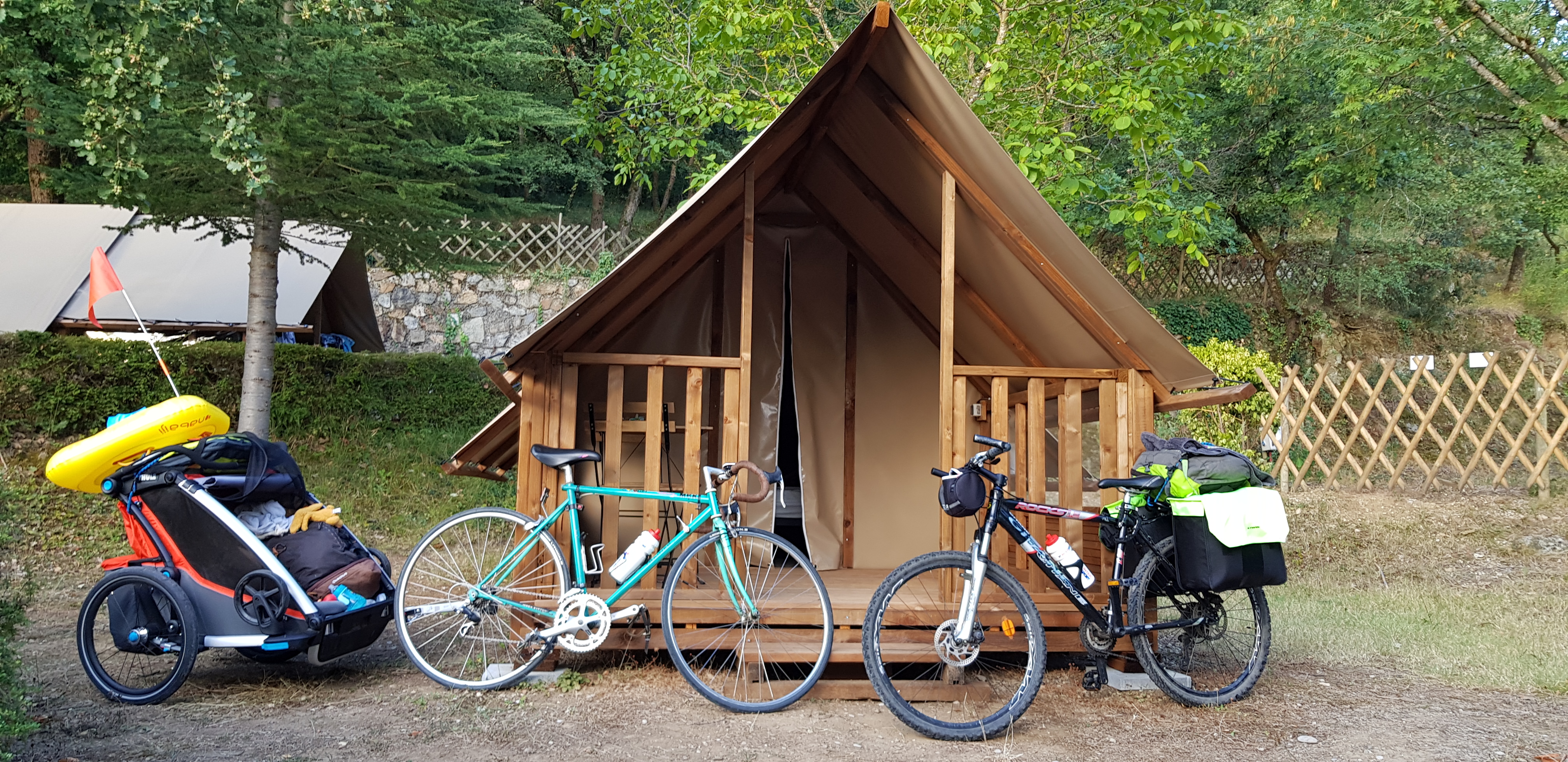 Vers St Vallier, le trafic est plus présent, mais nous ne sommes pas encore sur la ViaRhôna et les voies vertes côtoient les voies routières. Sur le reste de l’étape, le trafic est moindre et la portion est assez ombragée. Nous rejoignons en fin de journée, sous la pluie, la ViaRhôna pour dormir au camping d’Iserand dans une petite cabane en bois, comportant un « garage » pour vélos.