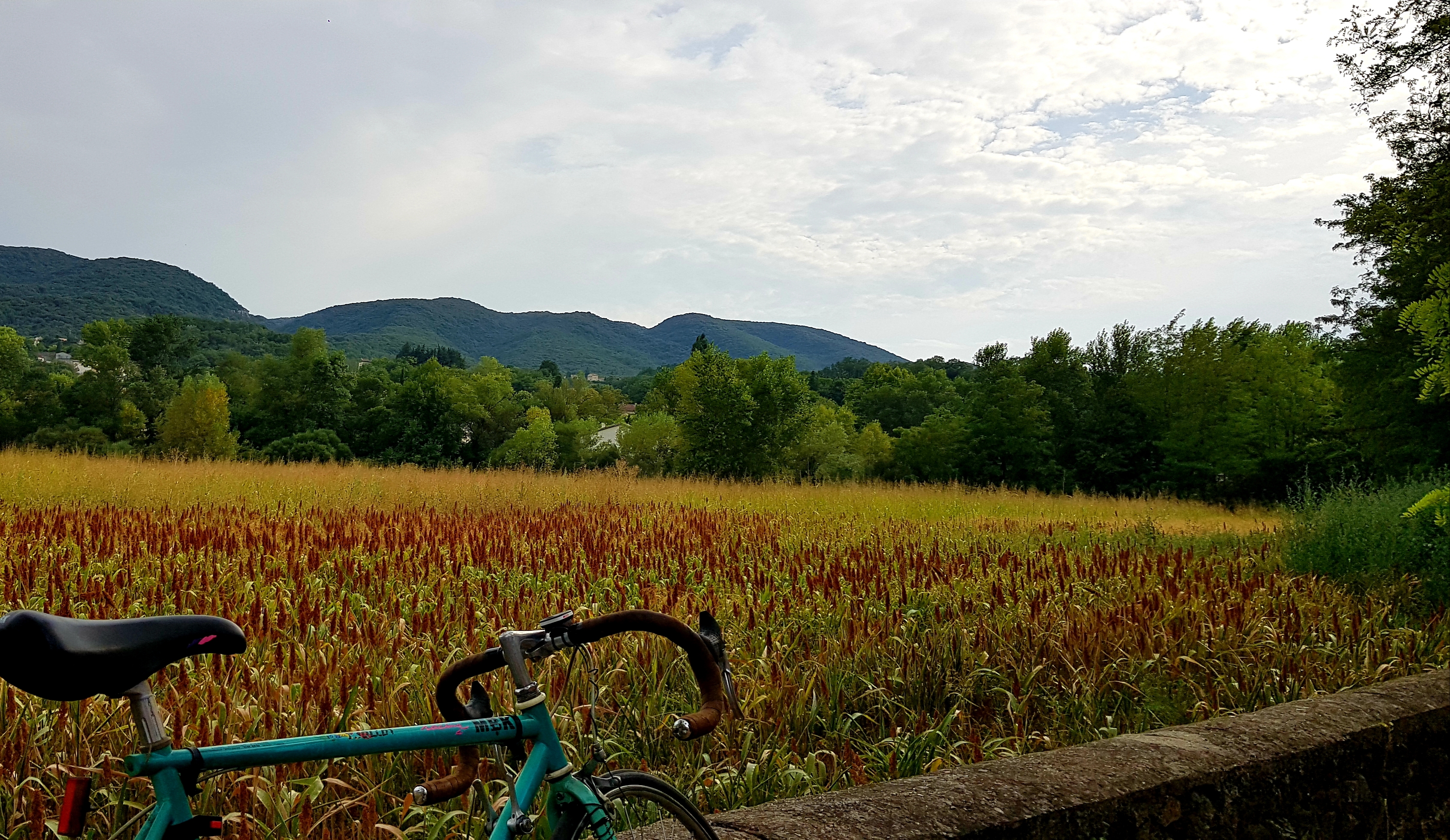 6e jour : étape longue et moins intéressante. Nous traversons Avignon. Cette ville est jolie et tout à fait adaptée aux vélos, puisque nous contournons tout le centre-ville. Lorsque nous sortons d’Avignon, la route se fait plus abîmée, plus monotone et le temps se couvre… . Après plus de 300 km, nous sentons arriver la fin de notre jolie aventure!