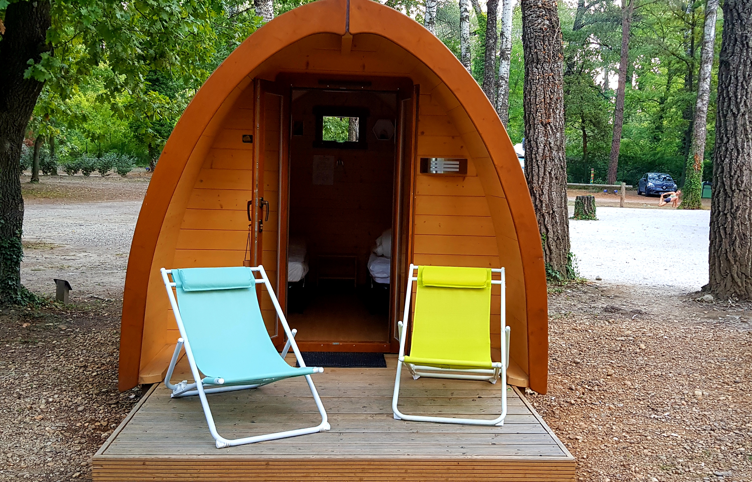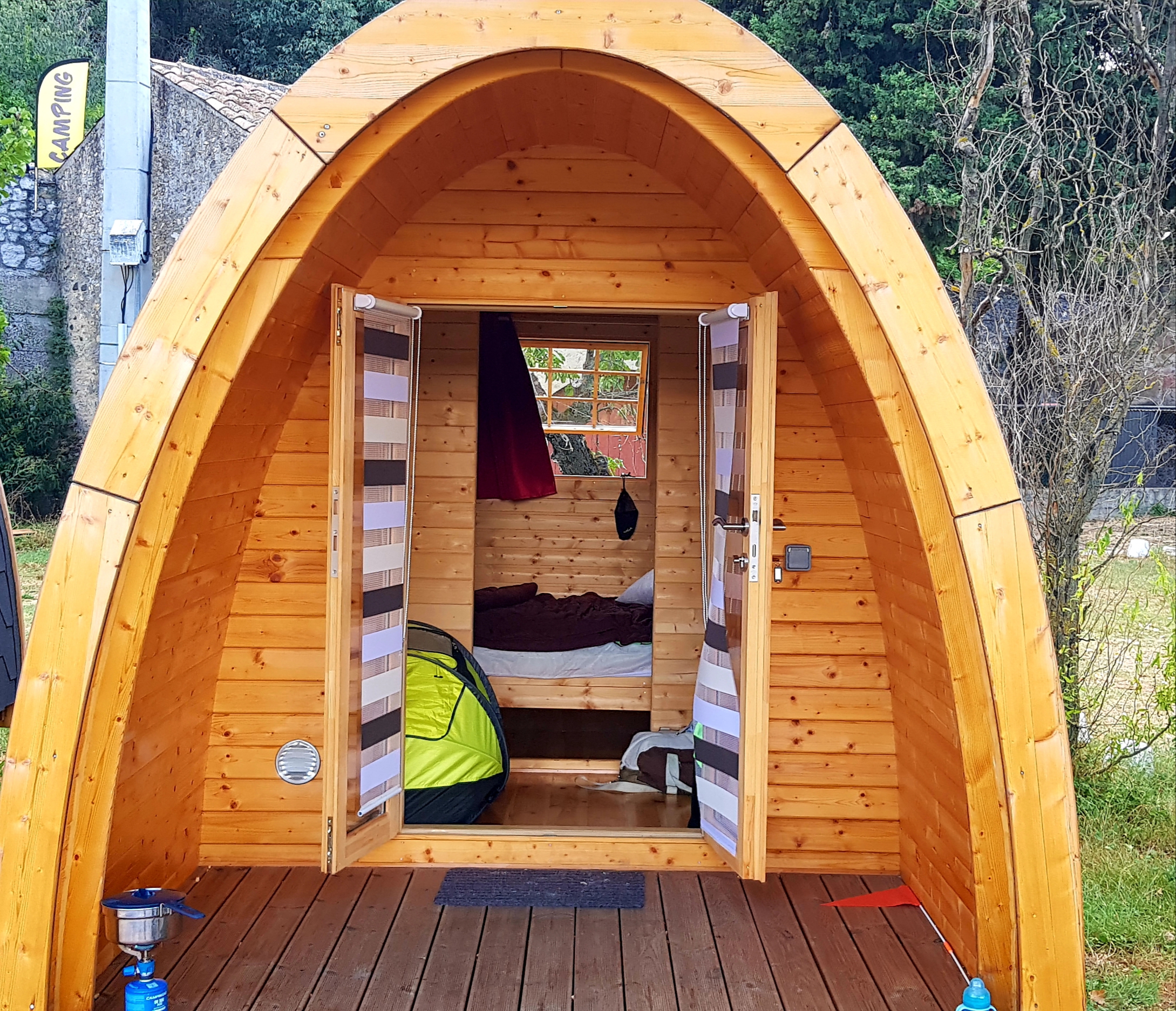 Nous arrivons, par une jolie descente au camping l’Art de vivre, dans un 2e POD, plus petit mais tout aussi mignon que le 1er. L’emplacement du camping et la piscine sont agréables et nous avons profité de n’avoir personne à côté pour sortir le réchaud, autour d’un petit verre de Châteauneuf .