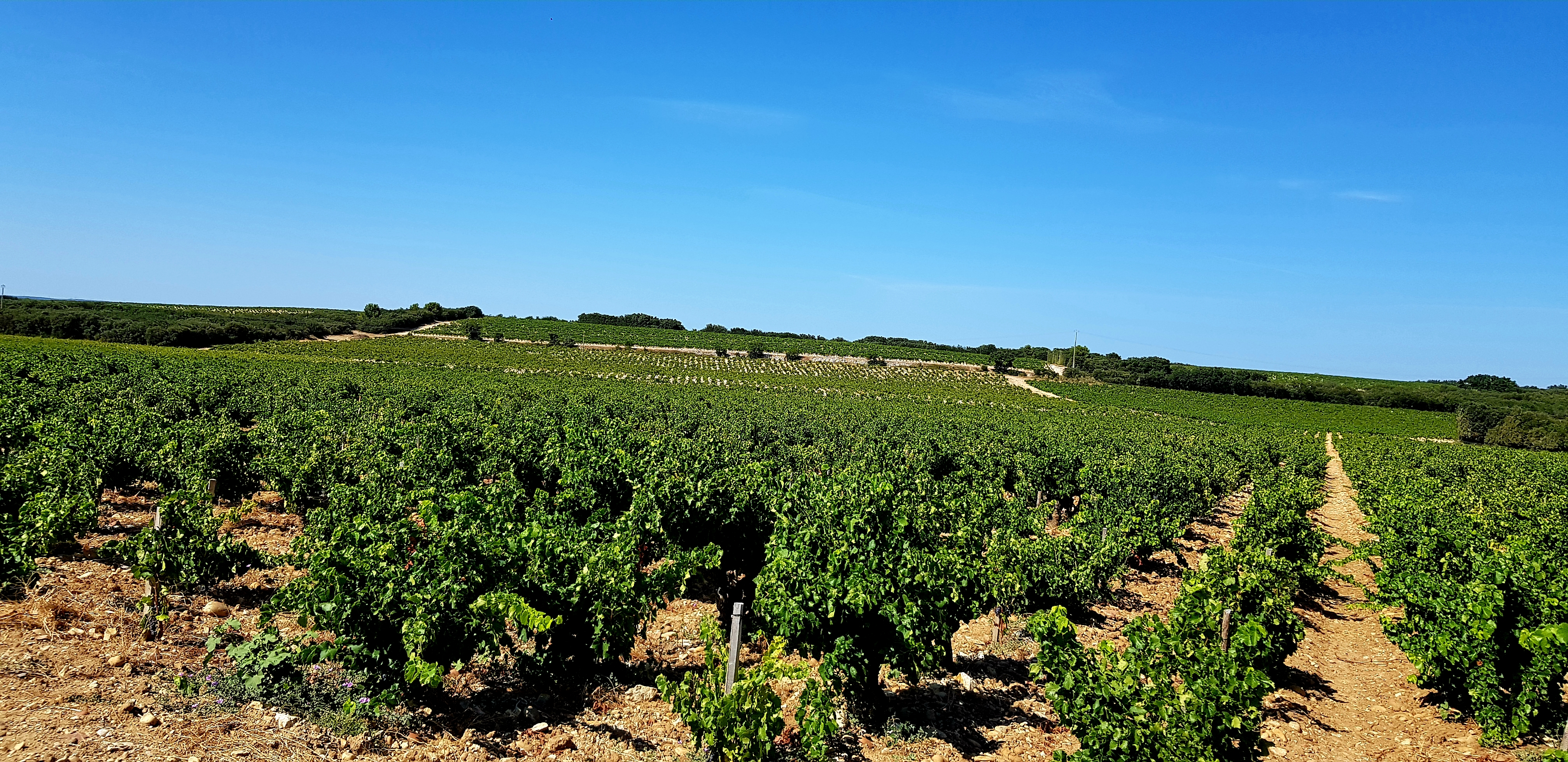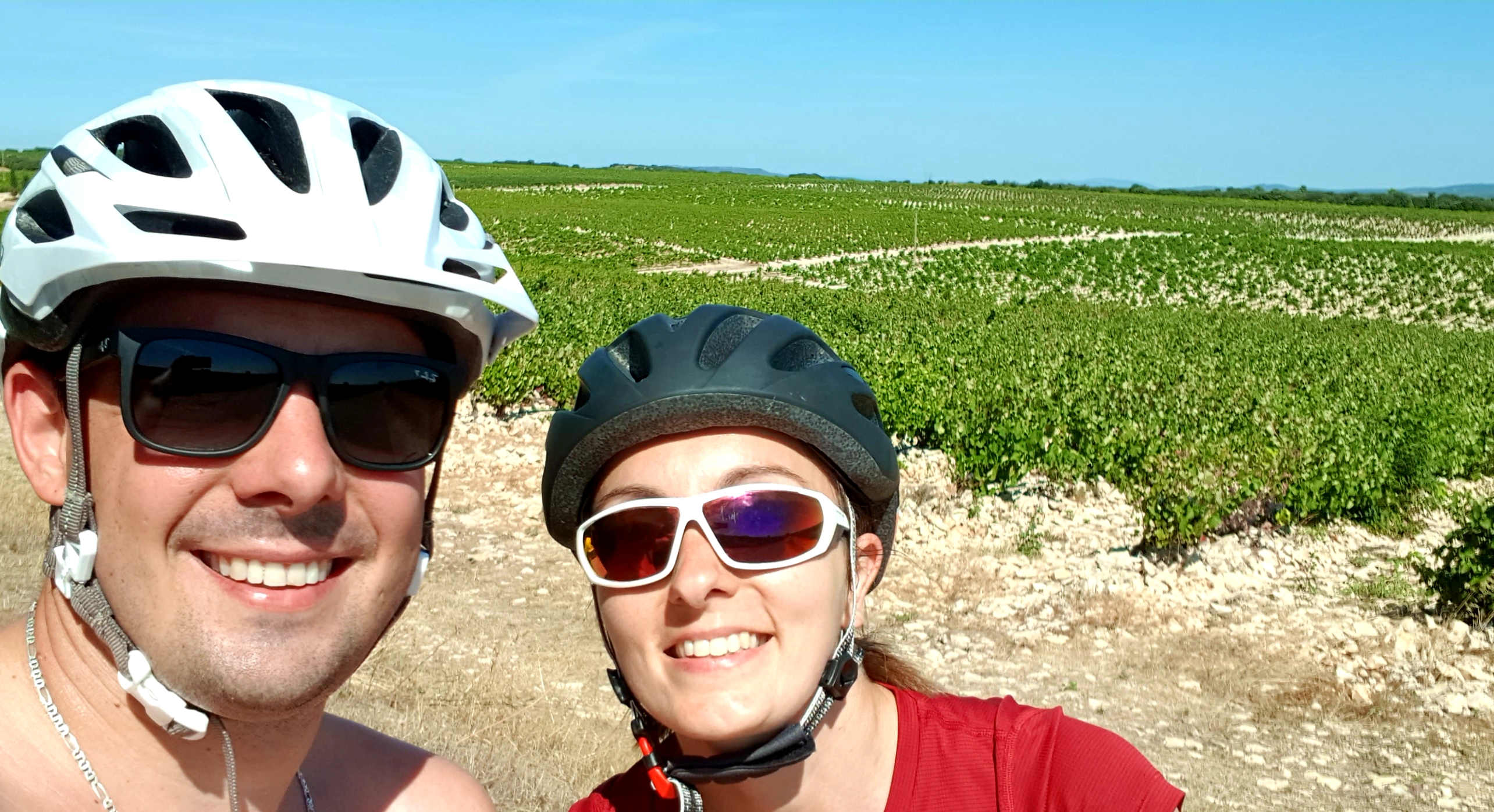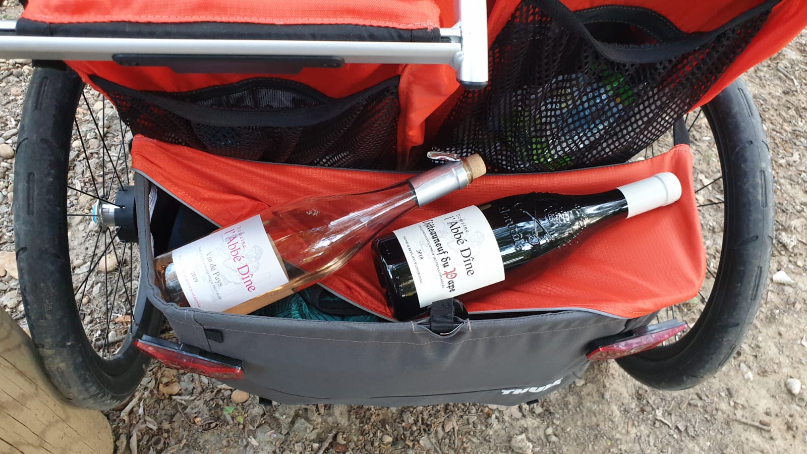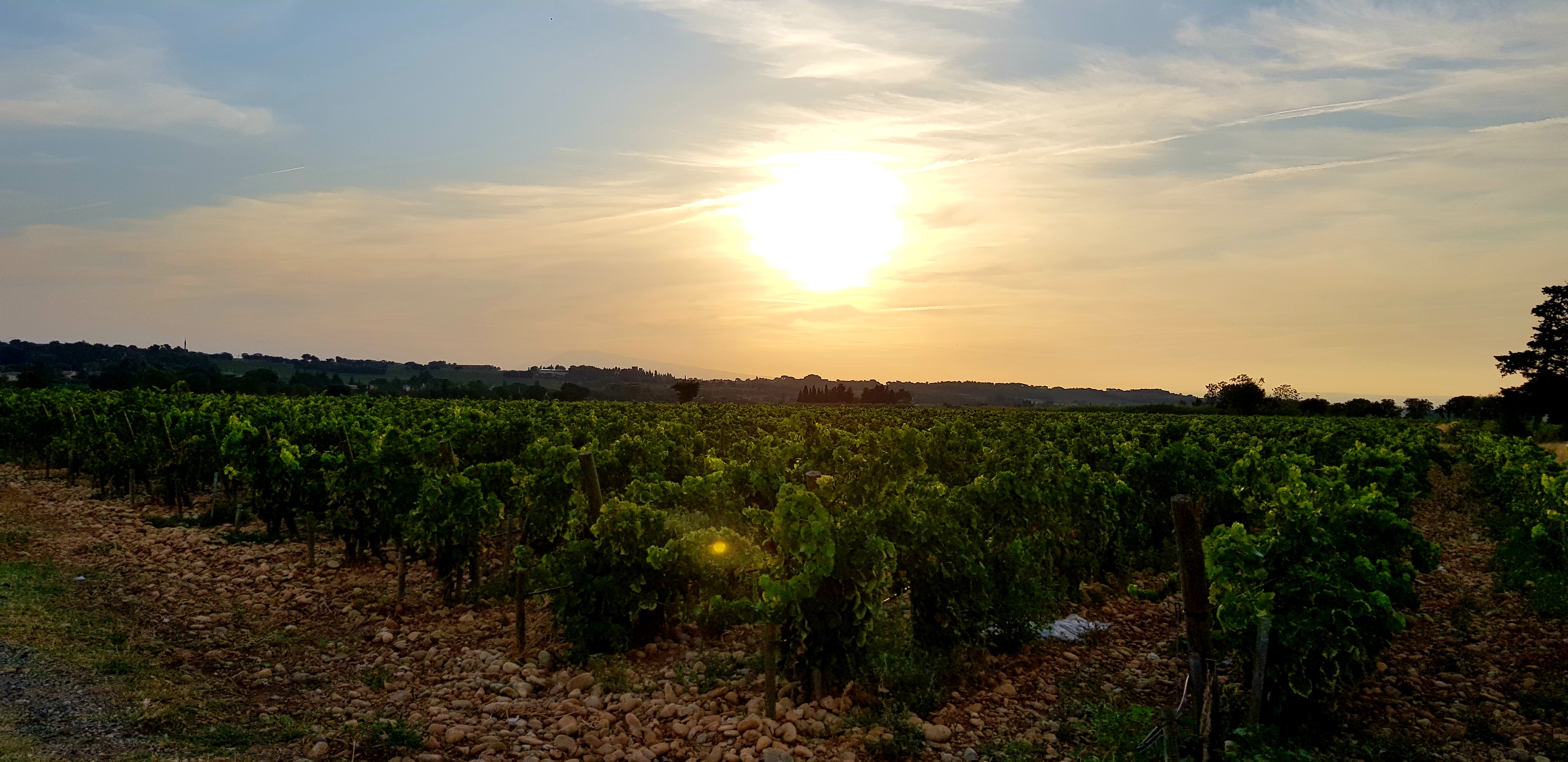 5e jour : plus petite étape du séjour => 15 km. Nous avons toujours ce temps magnifique, et traverser les chais avec ce soleil est vraiment bucolique. Partis d’Orange, nous avons assez vite attaqué les montées pour aller sur Châteauneuf du Pape … Aurélien, chargé à 50 kg et moi à 25 kg, les montées furent longues et intenses mais peu techniques… . Cette étape reste l’une de mes plus belles.