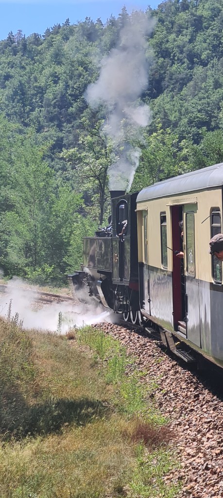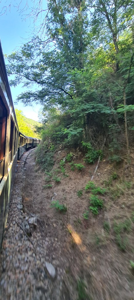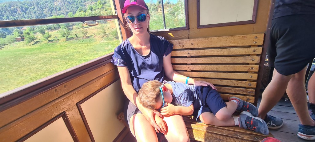 2e jour : nous partons direction Lamastre à bord du Mastrou. Monter dans ce train, fait partie de l’aventure ardéchoise. Lorsque vous faites la Dolce Via avec des enfants, ce moment constitue l’attraction des 90 km, les enfants n’attendent que ça. Gaspard, qui était majoritairement dans la carriole, même s’il faisait de la draisienne, a aimé regarder tous les composants du train, la fumée, visiter le wagon et il s’est même endormi, alors que cette virée n’est pas très silencieuse. Ce train à vapeur, passe en surplomb des gorges du Doux permettant d’admirer toute sa vallée sur 28 km. Nous avons pu admirer Colombier le vieux, faire une petite pause à Boucieu Le Roi, observer le pont des soupirs et passer le 45e parallèle (équidistance entre l’équateur et le Pôle Nord : 5000 km de part et d’autre° pour finir à Lamastre, connue pour sa délicieuse crème de marron et ses criques de pomme de terre.