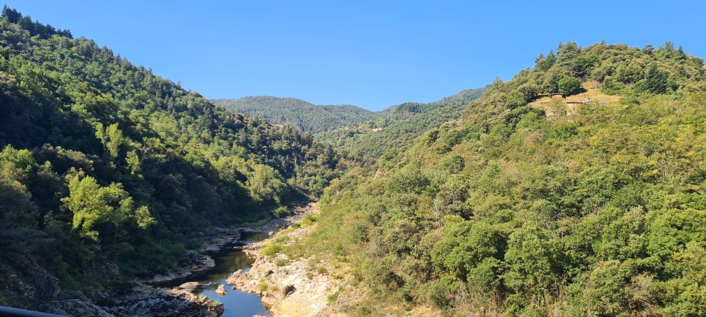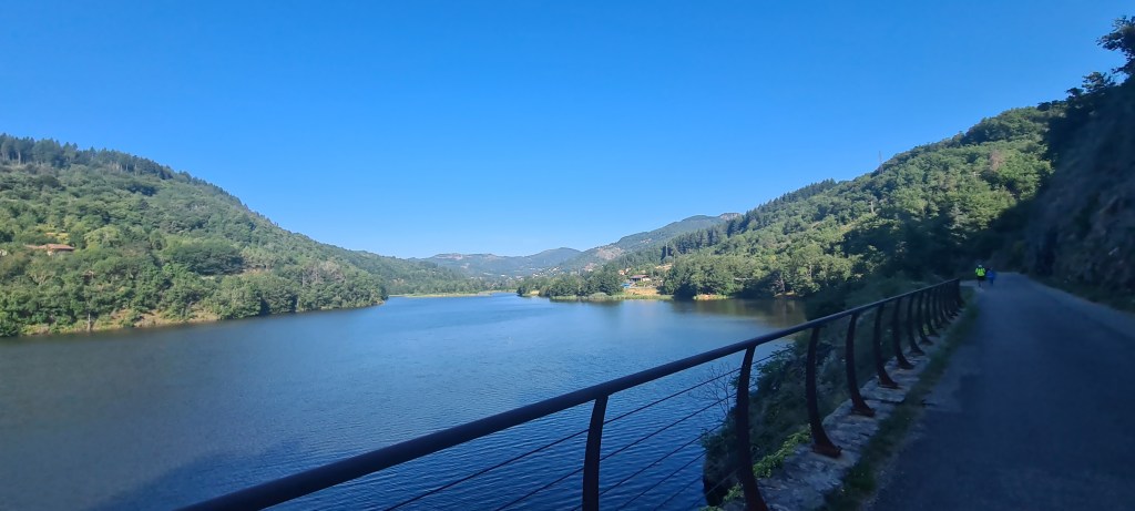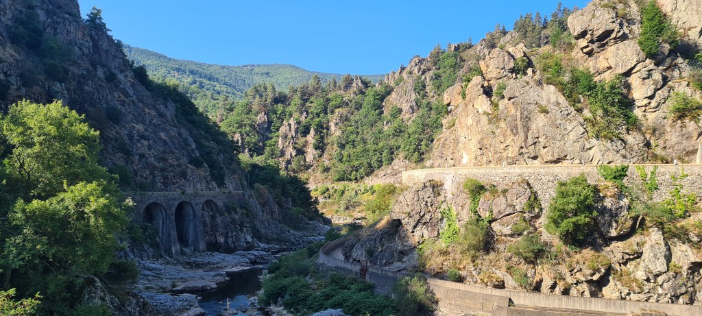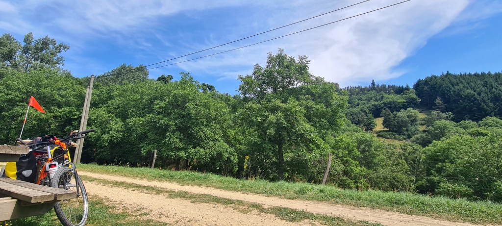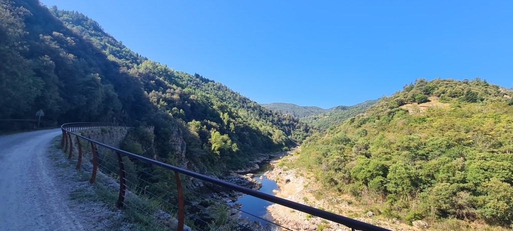 Après, ce moment détente d’environ 45 min, nous avons repris nos vélos, pour faire les 21 km qui sépare Lamastre du Cheylard. Cette étape est la plus « technique » des 3 jours. Le sentier monte en faux plat, sur un chemin de terre, jusqu’aux Nonières, soit 12 km plus tard et étant chargés comme nous l’étions, nos jambes l’ont bien senti. Passé le tunnel des Nonières, les 9 derniers km sont un vrai terrain de jeu descendant et roulant. Les paysages sont superbes et notamment la vue sur le Mont Mezenc et le Mont Gerbier de Jonc. Avec cette étape, nous avons traversé viaducs, ponts et tunnels puis nous avons planté la tente au seul camping, dont dispose le Cheylard, sans piscine mais avec un accès direct à la rivière.