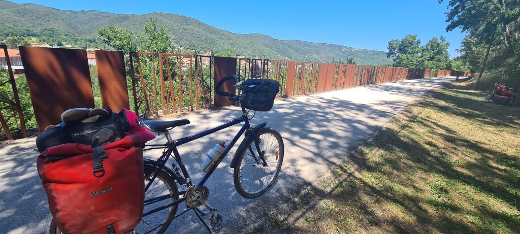 1re jour : cette étape n’est pas la plus intéressante mais elle permet de prendre le temps sur la ViaRhôna, de se mettre en jambe et de commencer en douceur la Dolce Via. Nous avons planté la tente au camping le Castellet, à St Jean de Muzols. Après 52 km de vélos sous le soleil, je peux vous dire que la glace et la piscine nous ont fait le plus grand bien pour terminer cette journée. Le choix du camping, a été stratégique, puisqu’il se trouve à côté du départ du Mastrou, train à vapeur que l’on prenait le lendemain.